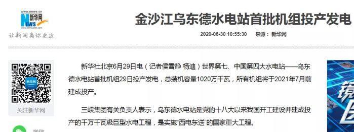 新華社北京6月29日電(記者侯雪靜 楊迪)世界第七、中國第四大水電站——烏東德水電站首批機組29日投產發電,總裝機容量1020萬千瓦,所有機組將于2021年7月前建成投產。
